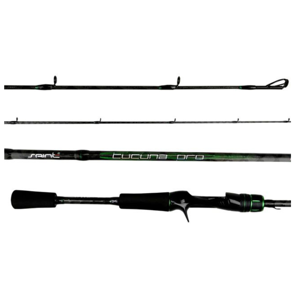 Designer repaginado, a Tucuna Pro Saint Plus é composta por Blank (haste) em carbono IM-10 com excelente acabamento, passadores óxido de alumínio, cabo de EVA com detalhes em cortiça e alumínio e Hook Keeper dobrável (segurador de isca ou anzol).
